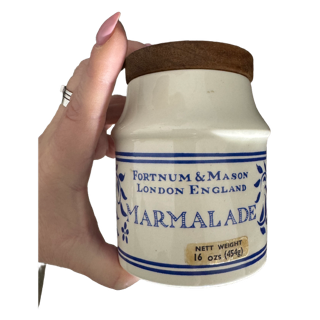 Fin engelsk marmeladburk i porslin med trälock. Begagnad. Text i botten: Designed and produced specially for Fortnum & Mason Ltd. Piccadilly, Estableshed 1707. Crown Devon, England. Potters for over 100 years (se bild på text). Storlek: höjd 11,5 cm, bredd 8,5 cm. Gott skick i stort men åldersrelaterat slitage då locket inte längre sluter tätt.