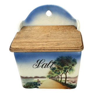 Äldre saltkar i porslin. Fint mönster på framsidan. Begagnad. Märke och nr i botten (se bild). Skick: Åldersrelaterat slitage. Det finns en liten ytlig spricka inuti.