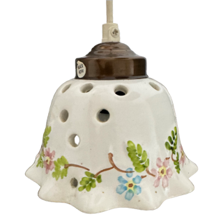 Fullt fungerande lampa i keramik. Mönster med söta blommor i blått/rosa och gröna kvistar. Begagnad. Skick: Mycket gott skick. Storlek: höjd 12 cm och bredd 15,5 cm.