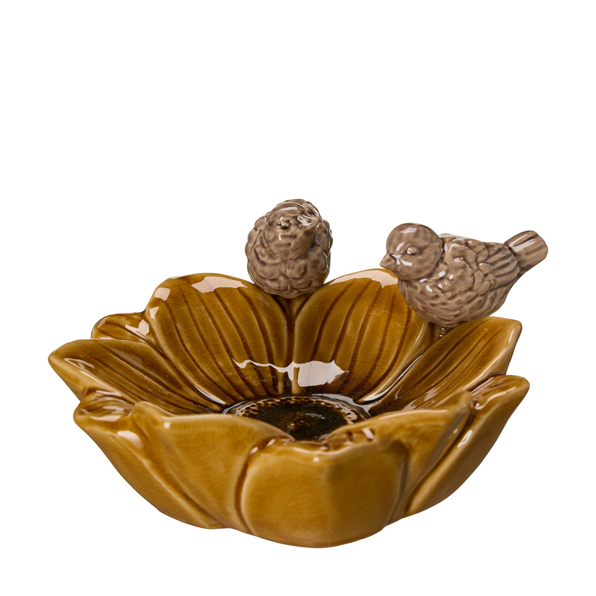 Jättesött fågelbad från Wikholm form som ser ut som en blomma i gul och brunt med två fåglar. En fin dekoration till din trädgård eller till altanen. Detta är en unik produkt som är glaserad med en teknik som kallas för reaktiv glasering. För hand blandas olika glasyrer som tillsammans reagerar när de bränns på de extremt höga temperaturer som keramik kräver. Detta ger ett mycket vackert resultat, subtilt skiftande färgvariationer och effekter som gör varje föremål unikt. Det finns inte två som är exakt lika.