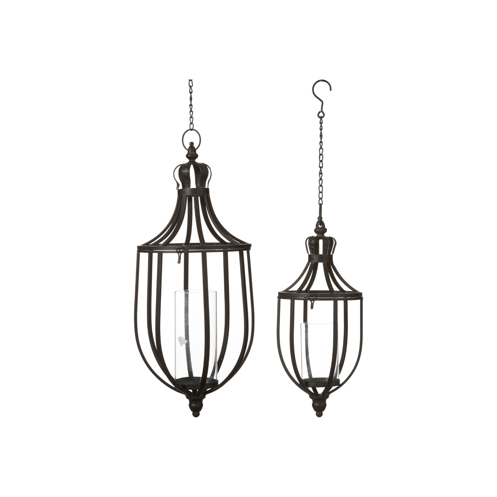 Vackra hänglyktor i antik svart. Den stora lyktan är 25x56 cm och den mindre 18x41 cm. Medföljande kedja om 28 cm. Material: järn och glas. Märke: Wikholm form.