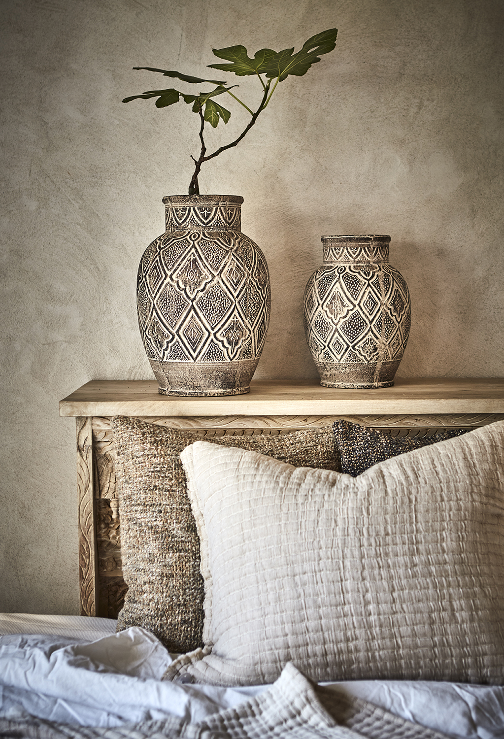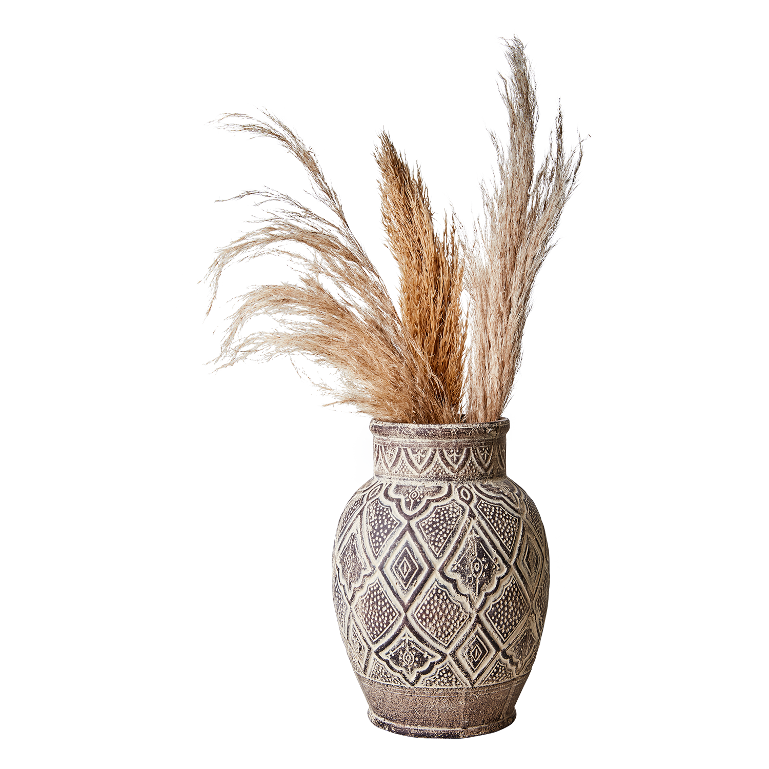Urna i ljusbrun terrakotta från Affari of Sweden med ett vackert och spännande marockanskinspirerat mönster. Fin att använda som vas till torkade blommor eller dekorationsväxter men är även en vacker inredningsdetalj utan innehåll.