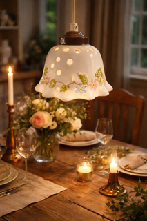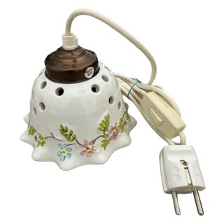 Fullt fungerande lampa i keramik. Mönster med söta blommor i blått/rosa och gröna kvistar. Begagnad.