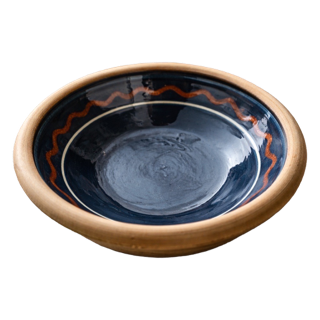 Fina keramikskålar i set om 4 st med blå glasering och mönster i rött och vitt på insidan. Begagnade.