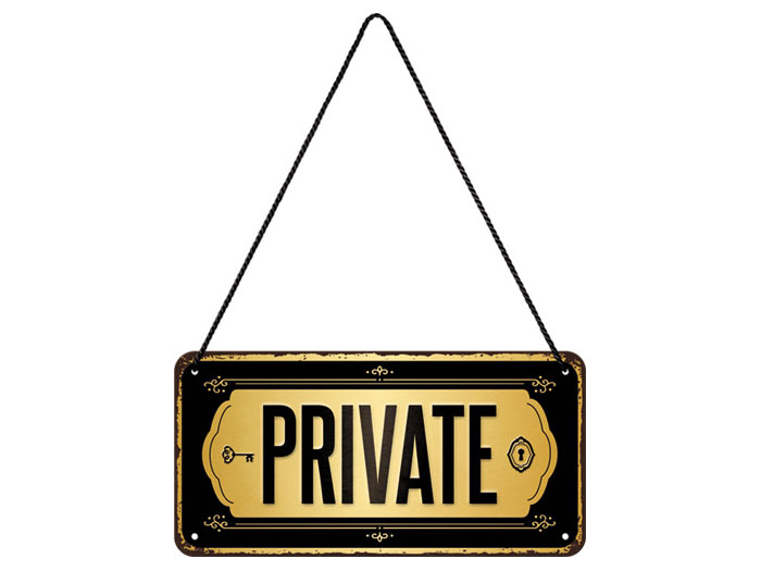 Plåtskylt med hänge. Text: Private. Storlek: 10x20cm.