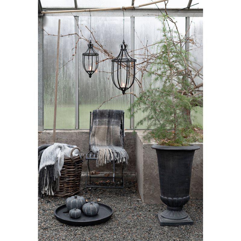 Vackra hänglyktor i antik svart. Den stora lyktan är 25x56 cm och den mindre 18x41 cm. Medföljande kedja om 28 cm. Material: järn och glas. Märke: Wikholm form.